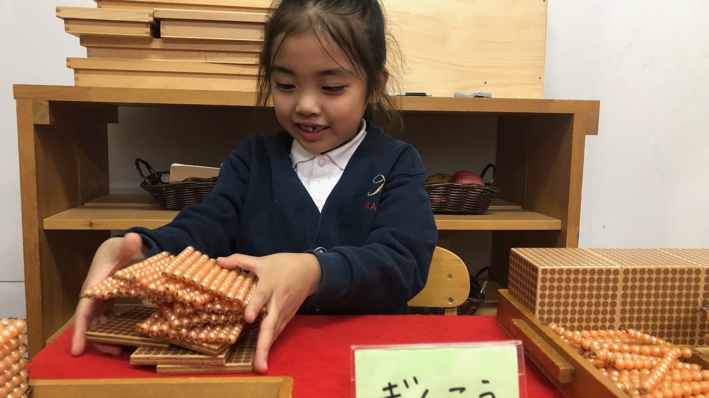 3~4歳頃には「いち、に、さん」と数に興味を示す「数の敏感期」が訪れます。モンテッソーリ教育の算数は、数字を教え込むのではなく、「数詞(いち)」「数字(1)」「量(1つ)」を結びつける“三者の一致”を重視します。ビーズやおはじきを使い、数のイメージを直観的に理解できるよう援助します。1〜10の理解ができると、大きな数まで一気に広がり、四則演算の理解もスムーズになります。数が「わかる」喜びが、学ぶ意欲につながります。
