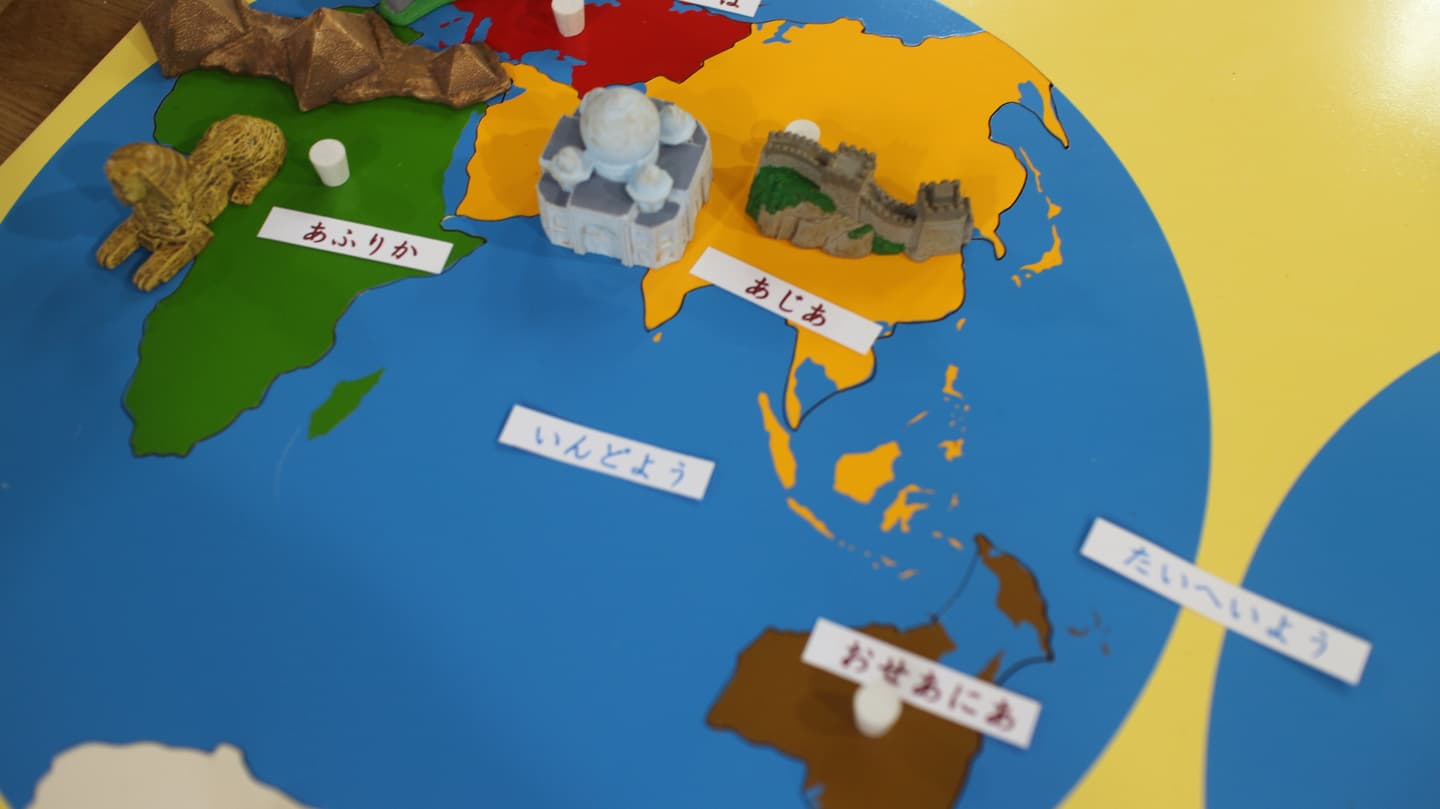 文化教育では「理科」や「社会」にあたる分野を扱い、宇宙・大陸・地図・昆虫などを具体物に触れながら学びます。イラストでは得られない形・重さ・質感を体験することで理解が深まります。モンテッソーリ教育では全体(宇宙)から部分(日本・県)の順番に学ぶことで、自分の位置づけがつかめ、興味も広がります。世界を意識する力はこれからの時代に欠かせません。国旗づくりや動物の生息地など、楽しく視野を広げる活動が、子どもの好奇心とグローバルな感覚を育てます。