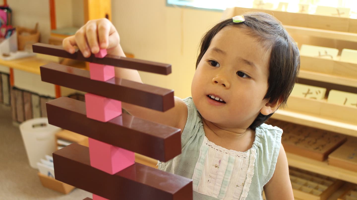 0〜6歳は五感が大きく発達する「感覚の敏感期」です。0〜3歳は見たり触ったり味わったりしながら、さまざまな感覚を吸収する時期。3〜6歳になると、今までの経験を整理し、「同じ」「大きい・小さい」「似ている」などの関係性を理解できるようになります。モンテッソーリの感覚教育では、専用の教具を使い「同じものを見つける」「順番に並べる」「仲間分けをする」といった活動を繰り返します。これらは将来の論理的思考の土台となる大切な学びです。