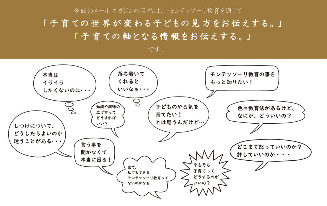 今回のメルマガでは、子育てをしている保護者様を対象として、モンテッソーリ教育を軸とした家庭でのわが子との関わり方について、実践例はもちろん、モンテッソーリ教育の考え方や子どもの発達、そして教育のトレンドについても情報を発信していきます。