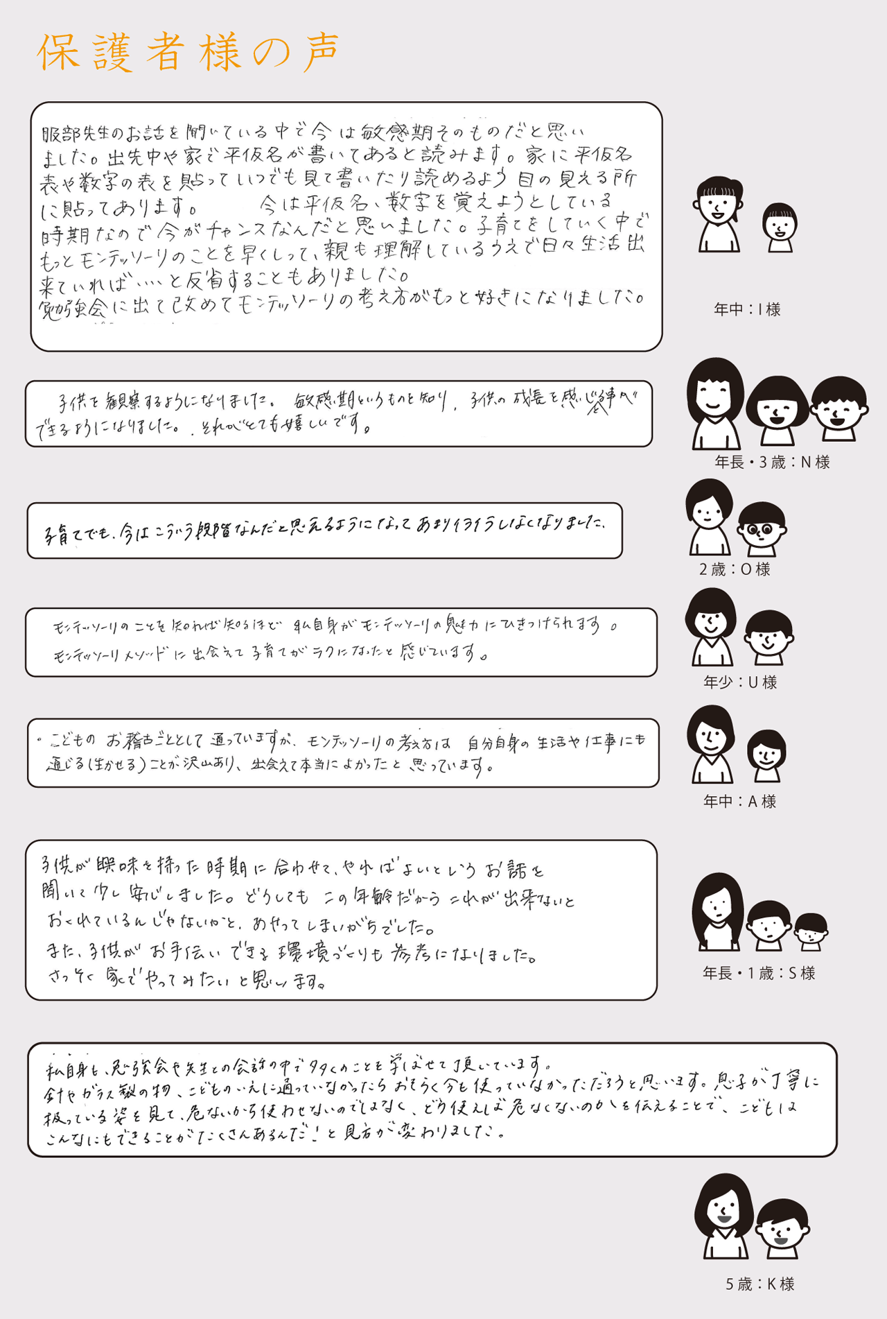その中で感じるのは、子どもの落ち着き具合や、物事への積極性などは、家庭での関わり方に同じような方向性が見られることです。それは、モンテッソーリ教育の考え方と合致する内容が非常に多く見受けられます。