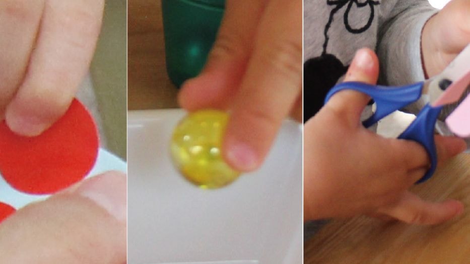 | 手先の発達が大きく進む | 1〜3歳は脳の神経回路が発達する時期。たくさんの経験をさせたい時期です。はままつこどものいえでは、「思い通りに動く手」を作る最初の段階として、ハサミで使ったり、シールを貼ったりして、鉛筆やお箸の持ち方につながる手先の動きをたくさん経験してもらいます。 |