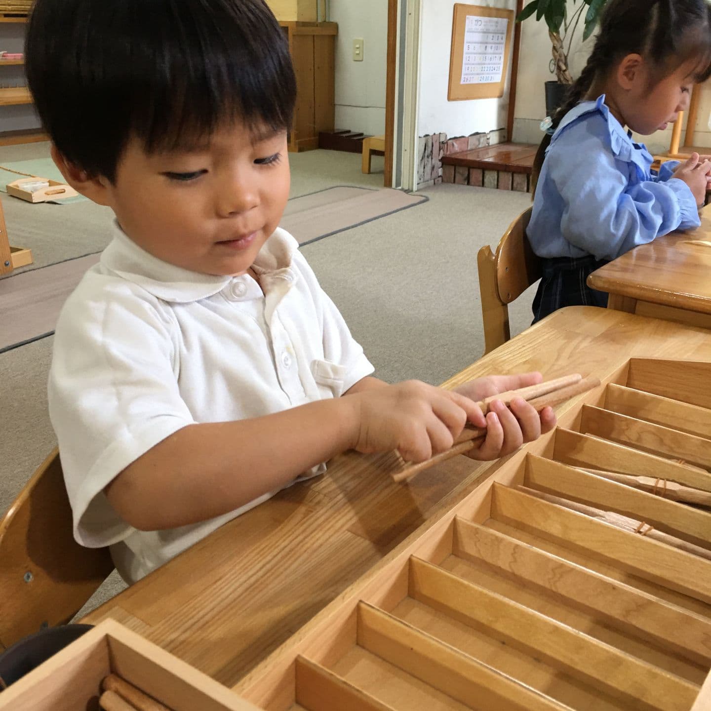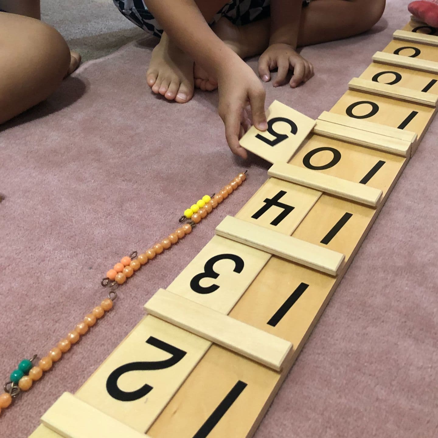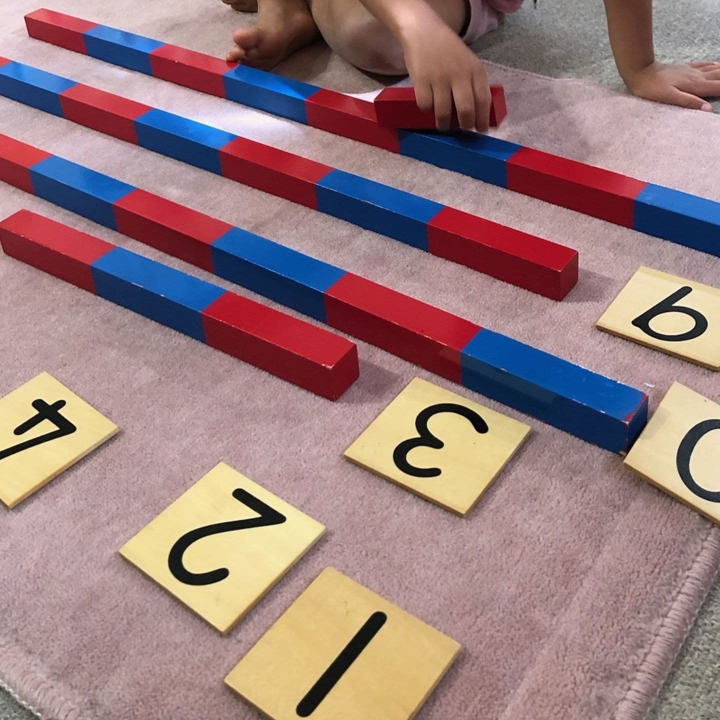 算数棒は長さの棒に色分けを加えた教具で、順番の概念を数字へ結びつけるおしごとです。数詞と言葉と数量の大きさを対応させ、数への理解を深めます。