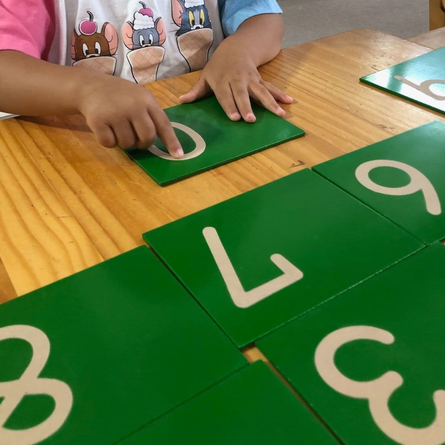 砂数字板は数字の形と書き順を指で感じて覚える教具です。紙やすりの感触をなぞることで、鉛筆よりもわかりやすく数字の書き始めを助けます。