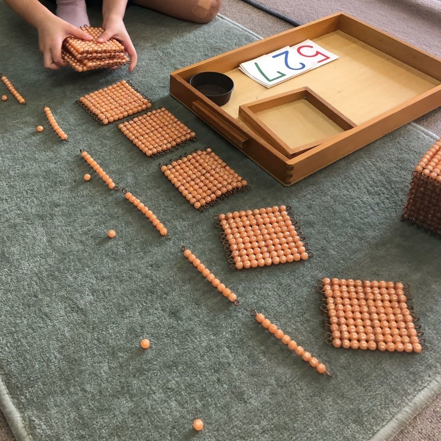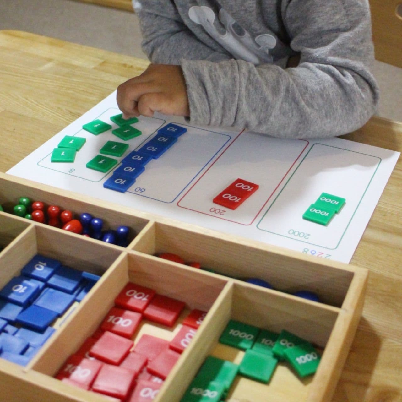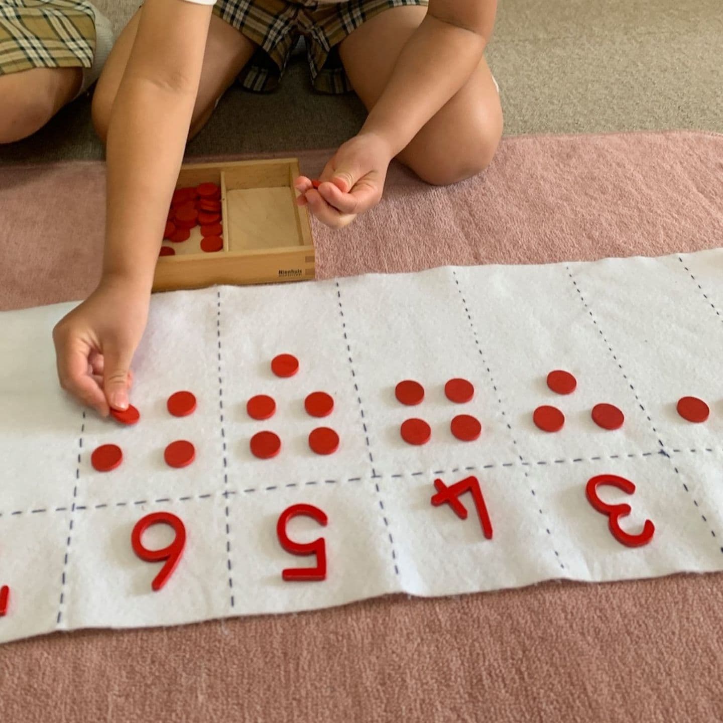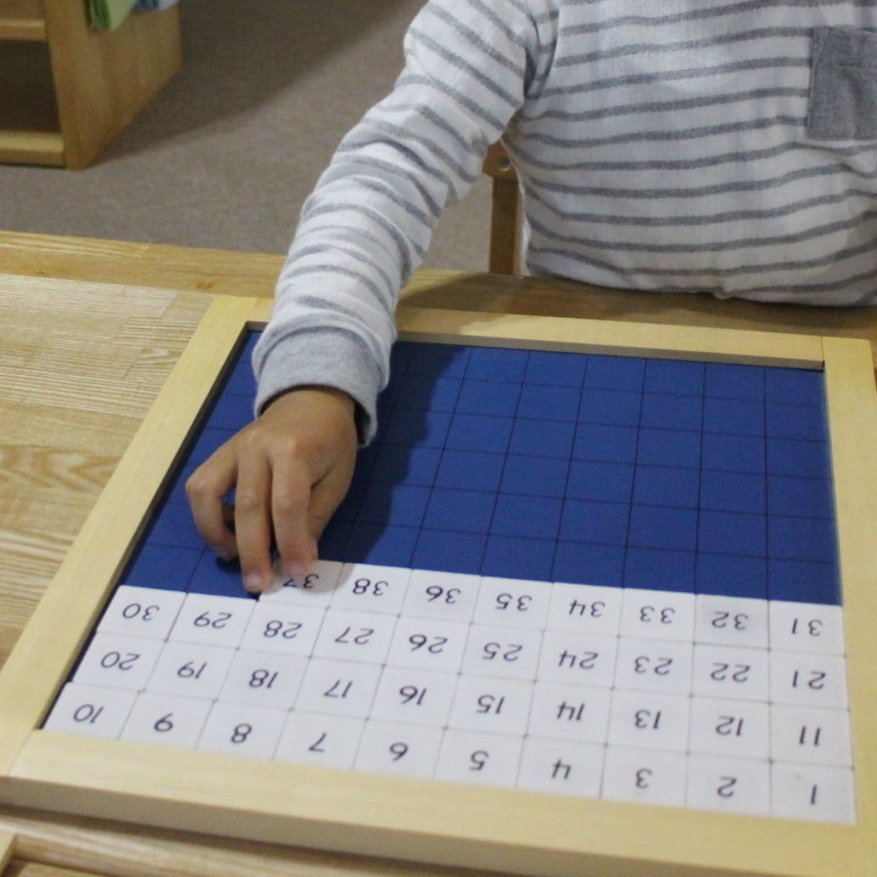 100並べは1〜100のチップを順に並べ、数字の規則性を視覚的に理解するおしごとです。数の敏感期に、100まで数えられることは大きな自信になります。
