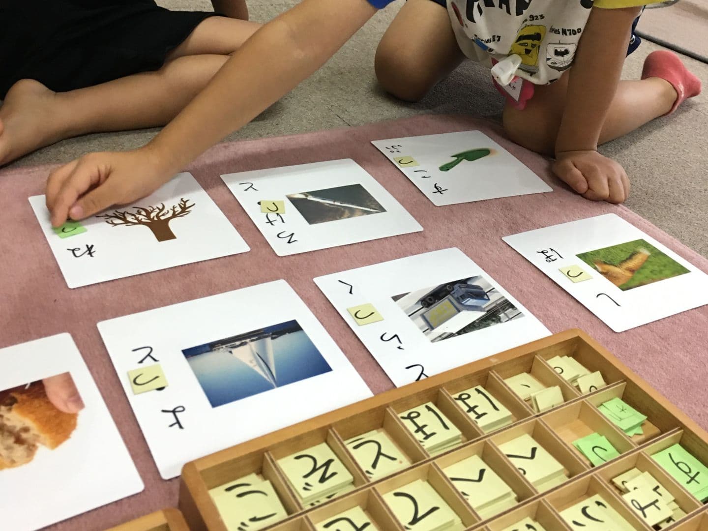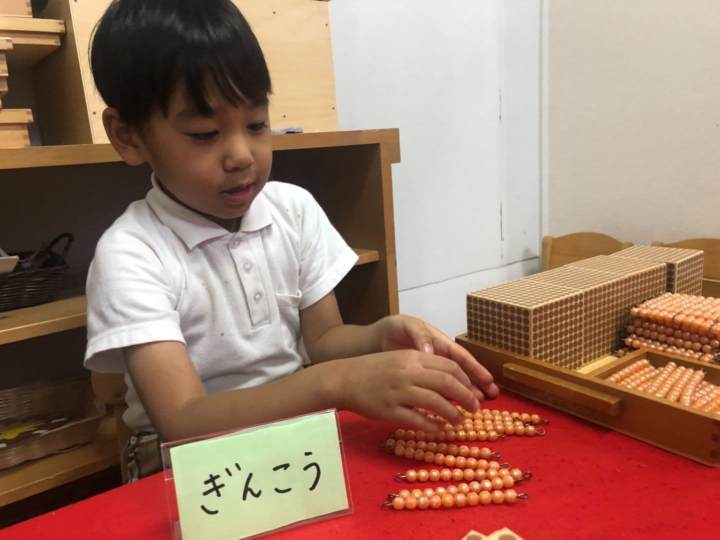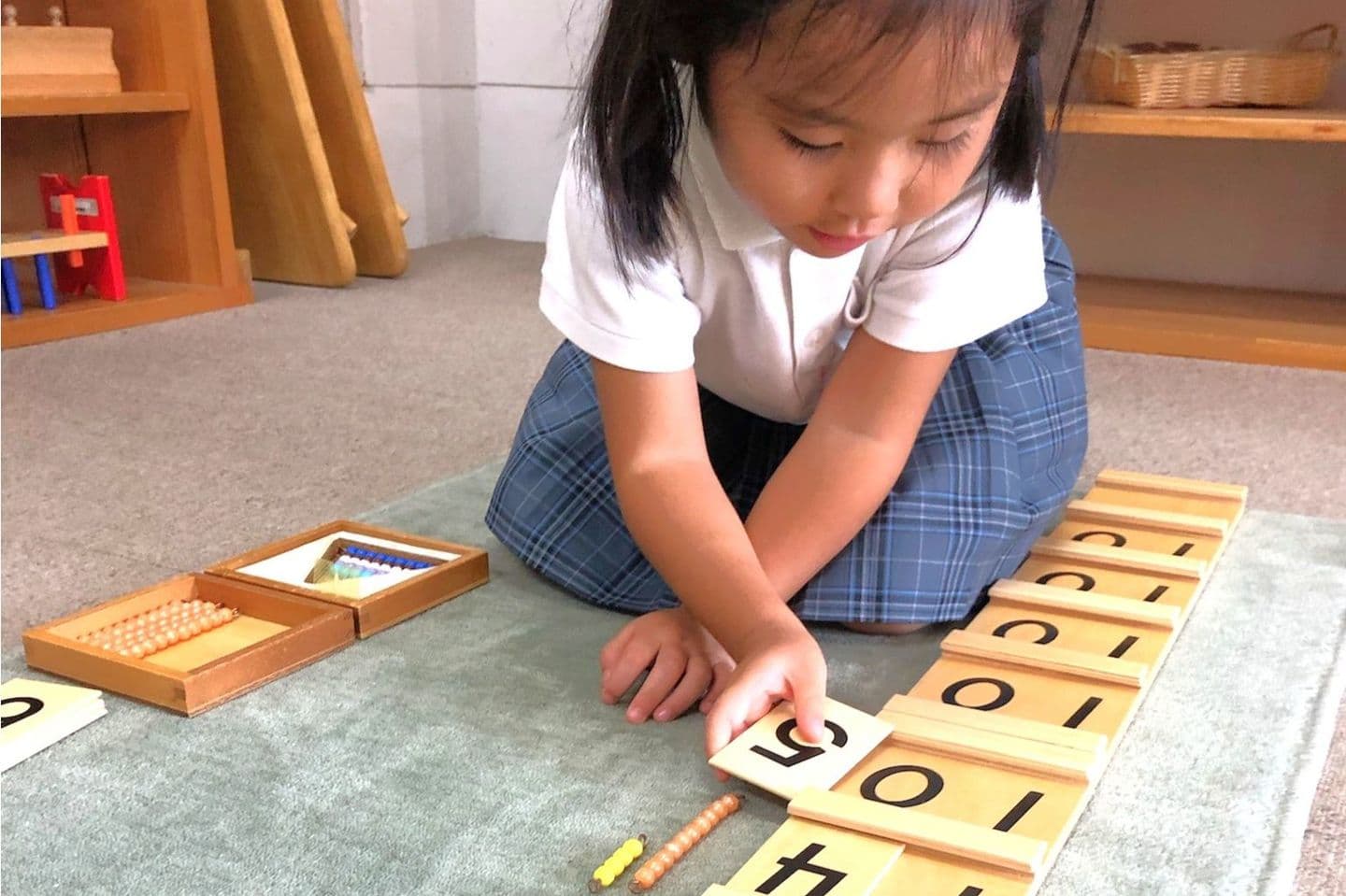 モンテッソーリ教育の特徴であるモンテッソーリ教具を使って、「文字」「数」「図形」「生物」「地理」等の広範囲にわたる知的活動を行います。